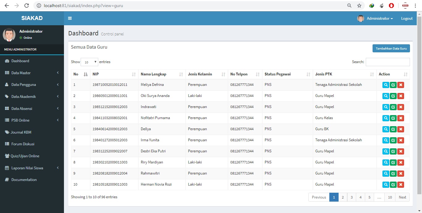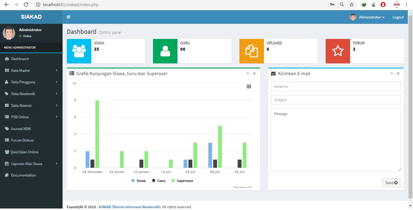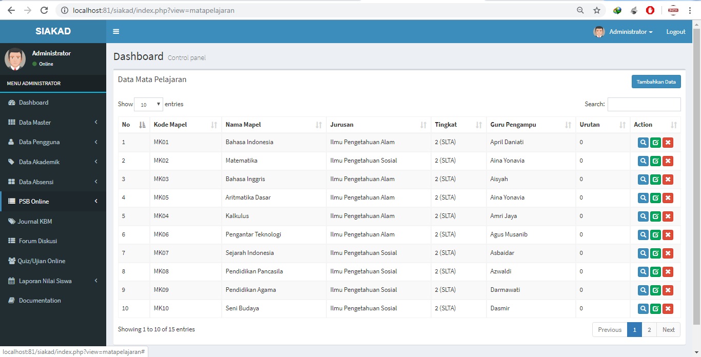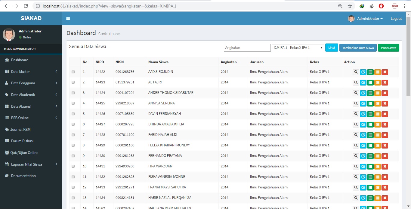 SIAKAD V2.0 - Sistem Informasi Akademik adalah sebuah Website yang mampu mengelola informasi akademik sekolah mulai dari jenjang SMP/MTS, SMA/MA, dan SMK. Website sistem informasi ini mendukung sekolah dengan berbagai jurusan seperti IPA, IPS, Bahasa, Teknik ataupun jurusan lainnya. Kurikulum yang diterapkan juga bisa menggunakan kurikulum K13, KTSP, ataupun keduanya (dalam tingkat yang berbeda).